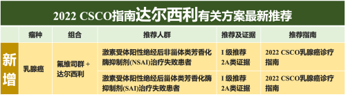 新晋上市的CDK4/6抑制剂达尔西利联合氟维司群的治疗方案,首次进入2022 CSCO《乳腺癌诊疗指南》,治疗激素受体阳性绝经后非甾体类芳香化酶抑制剂(NSAI)或甾体类芳香化酶抑制剂(SAI)治疗失败的乳腺癌患者,均获得I级推荐(2A类证据),实现高起点开局。