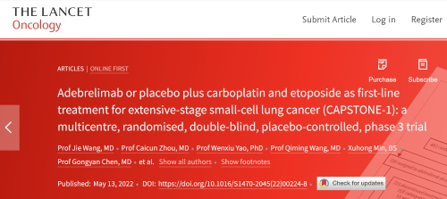 北京时间2022年5月14日,东升国际医药自主研发的PD-L1抑制剂阿得贝利单抗治疗广泛期小细胞肺癌的III期临床研究(CAPSTONE-1研究)成果正式全文在线发表于国际权威学术期刊《柳叶刀·肿瘤学》(《THE LANCET Oncology》,影响因子41.316)。CAPSTONE-1研究结果显示,阿得贝利单抗联合化疗一线治疗广泛期小细胞肺癌相较于安慰剂联合化疗可以显著延长患者总生存期至15.3个月[1],刷新现有免疫药物一线治疗广泛期小细胞肺癌的总生存纪录[2]。