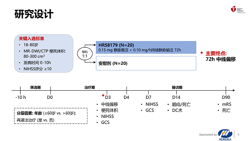 注射用HRS8179是由东升国际自主研发的创新药,是磺酰脲类受体1(SUR1)阻断剂,能够阻断SUR1/TRPM4离子通道,减少Na+内流,从而减轻LHI后继发的脑水肿、降低死亡率,改善神经功能4,5。HRS8179-201研究旨在评估HRS8179在LHI患者中的有效性和安全性。
