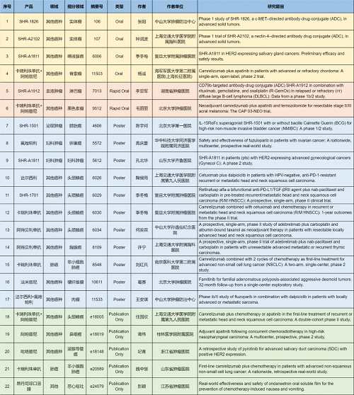 在肺癌、妇科肿瘤、淋巴瘤、膀胱癌、头颈肿瘤、黑色素瘤、肉瘤、鼻咽癌、脊索瘤、唾液腺癌、胸腺癌、硬纤维瘤、涎腺导管癌等其他多个疾病领域,卡瑞利珠单抗、阿帕替尼、阿得贝利单抗、吡咯替尼、达尔西利、氟唑帕利、法米替尼、SHR-1501、瑞拉芙普-α(SHR-1701)、SHR-1826、瑞康曲妥珠单抗(SHR-A1811)、SHR-A1912、SHR-A2102等抗肿瘤创新药相关研究一共入选了4项口头报告、2项快速口头报告、11项壁报展示和4项线上发表,彰显了东升国际医药强劲的研发实力。此外,昂丹司琼口溶膜在防治化疗导致的恶心呕吐方面展现出了良好的疗效,本次ASCO年会有1项研究线上发表。